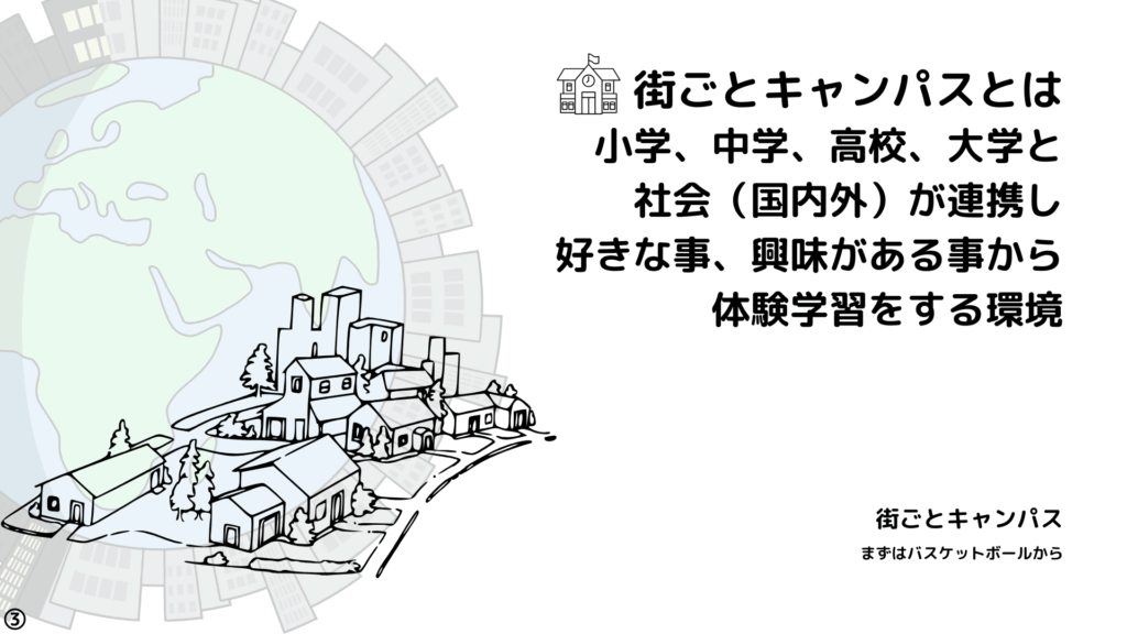 発案に至る経緯は、バスケットボール界も横の繋がりが強く、縦の付き合いがあっても小学と中学、中学と高校、高校と大学と隣のカテゴリーのみ、そこで将来の進路の為に、少し先(未来)のバスケット関係者とおつきあいする事で視野も広がるのではないかと考えた事が始まりです。